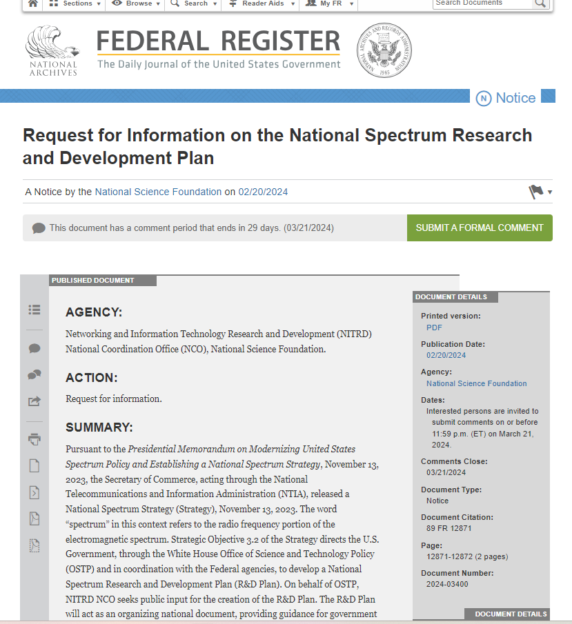 The NITRD WSRD IWG requests input from the public, including academia and industry, to assist in development of the National Spectrum R&D Plan.